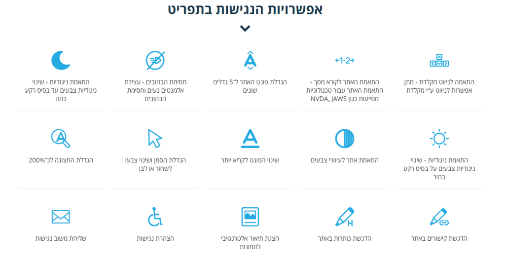 באתר מוצב תפריט הנגשה של חברת הנגשת אתרים – נגיש בקליק. לחיצה על כפתור הנגישות מאפשרת את פתיחת התפריט המכיל כפתורי ההנגשה. לאחר בחירת נושא בתפריט יש להמתין לטעינת הדף.